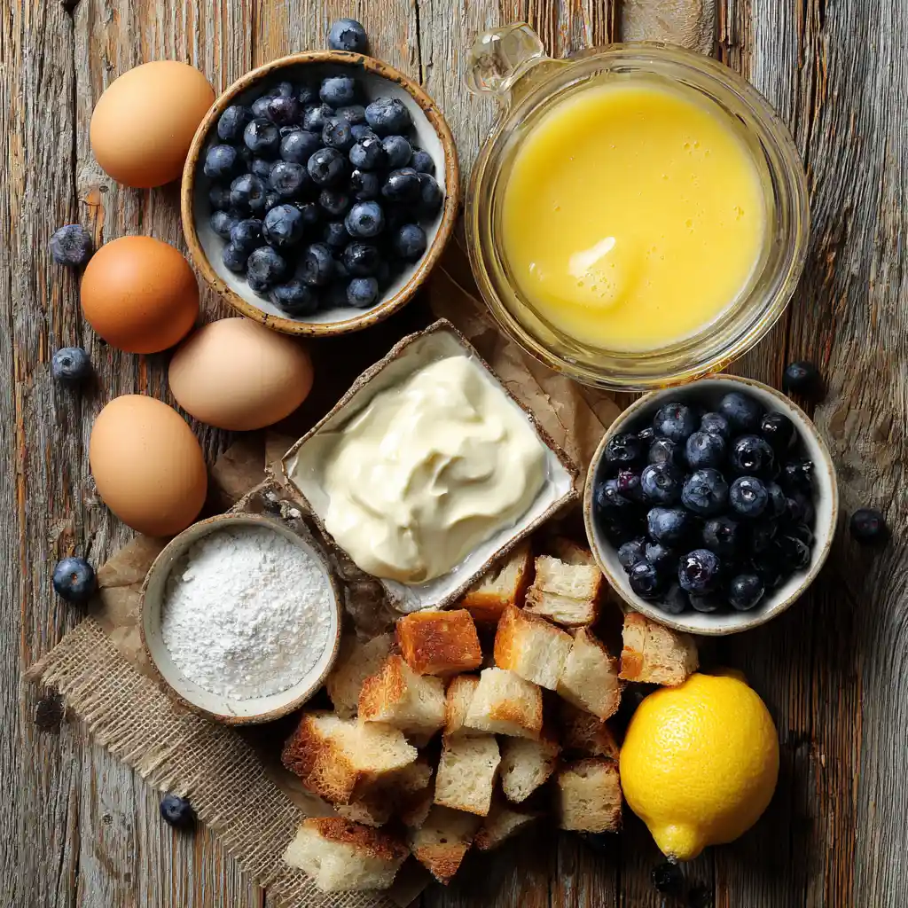This ingredient combination is where the magic begins. The eggs and cream form a smooth custard base, while the lemon curd and blueberries add freshness and tang that make this pudding unforgettable.