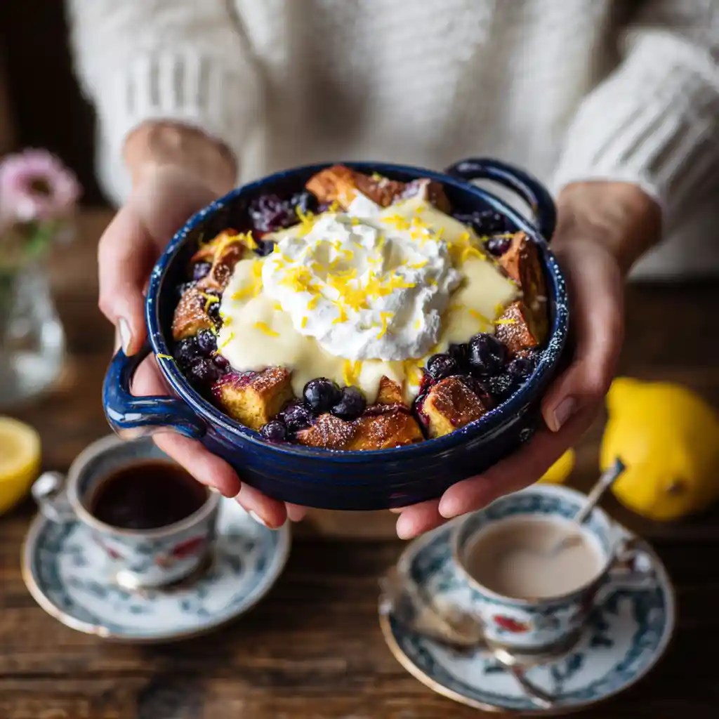 A cozy Blueberry Lemon Curd Bread Pudding made with creamy custard, tangy lemon curd, and juicy blueberries — the perfect balance of comfort and brightness.
