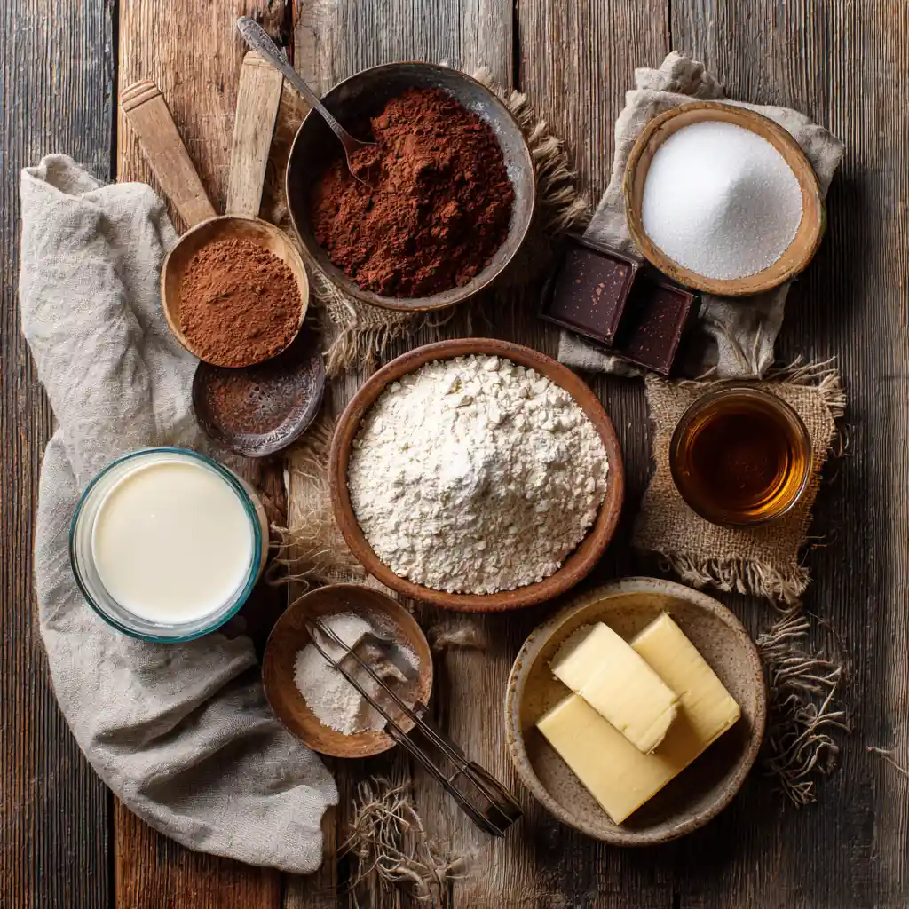 This cake with chocolate pudding is made from everyday ingredients you likely already have. Each one adds something special flour for structure, cocoa for depth, sugar for sweetness, and milk for that soft crumb every perfect pudding cake needs.