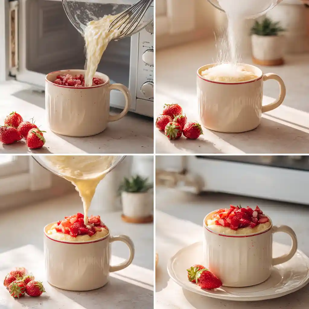 Making Light Strawberry Mug Cake takes just a few simple steps. Because everything mixes directly in the mug, cleanup stays minimal.